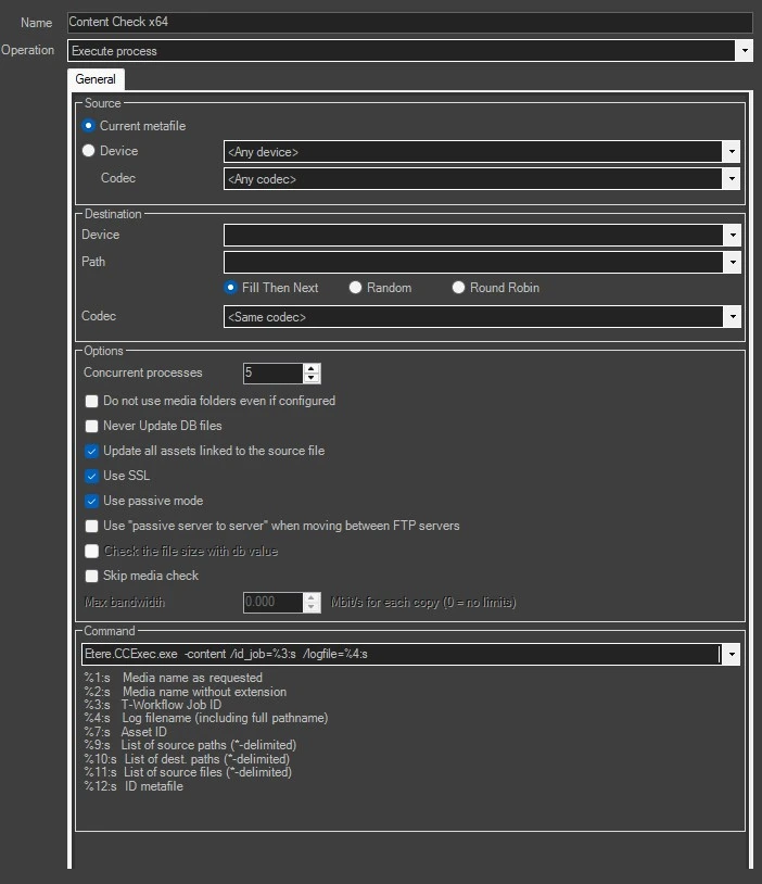 • Operation: Since the content check operation is carried out by Etere.CCExec.exe, select "Execute process".