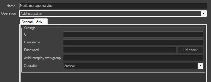Url (mandatory): URL on which the Avid Interplay Web Services is available: http://[AvidInterplayServer]:[Port]/services
