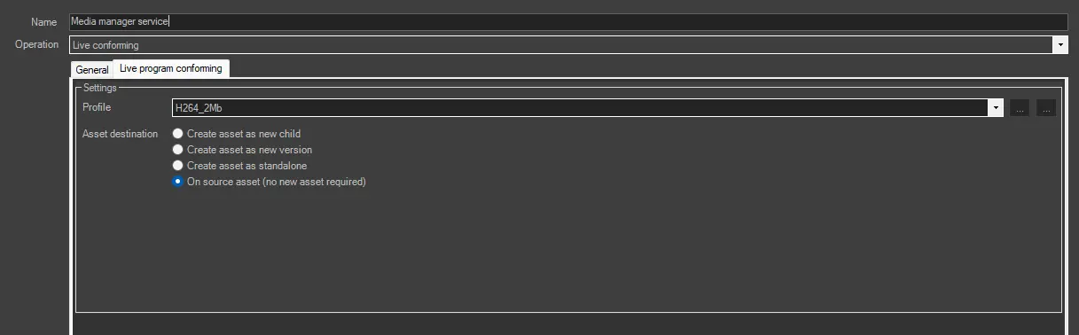 Asset destination: Choose on which asset the conformed file should be linked to.
