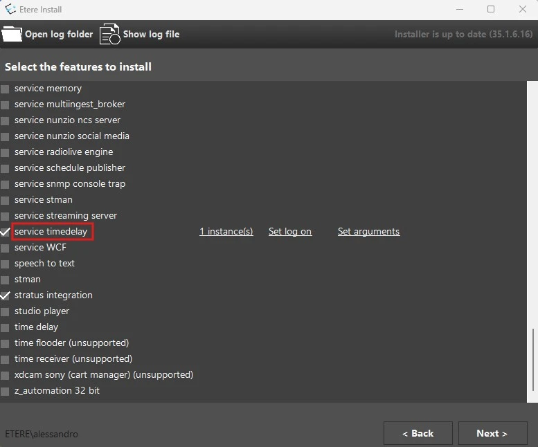 In Etere Update module, select the feature service timedelay, choose the number of instances to install and set the log on.
