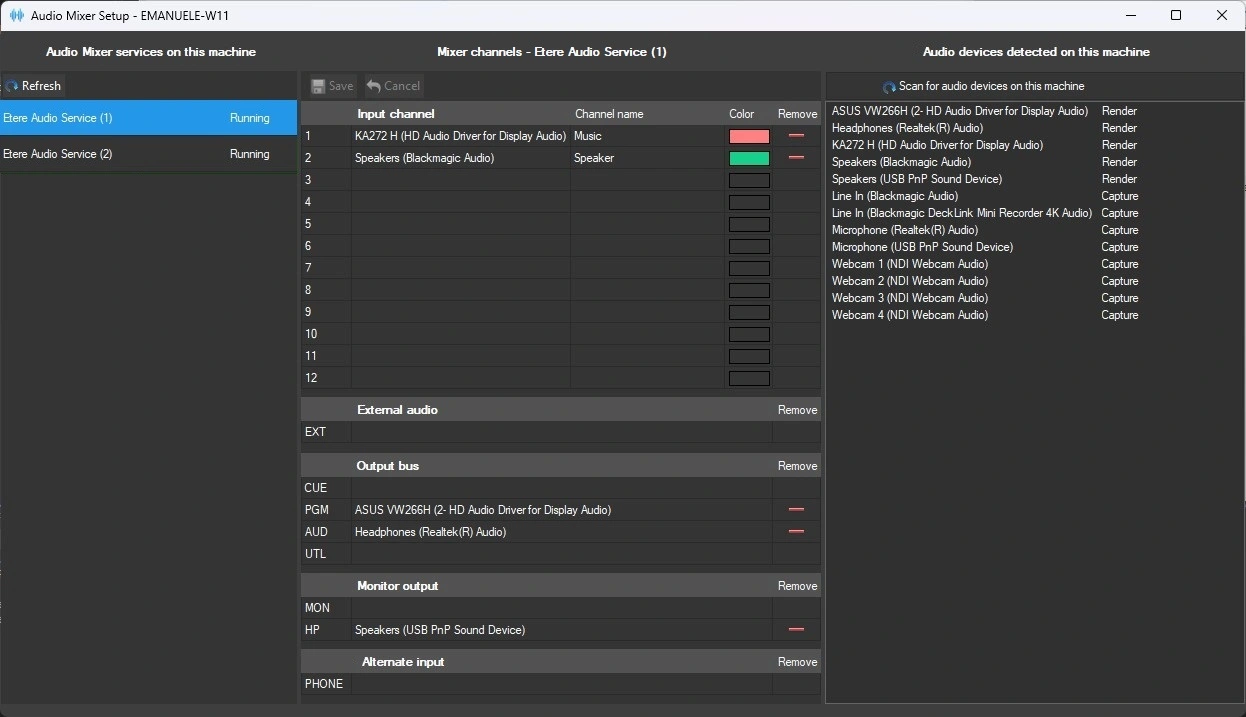 Here it's possible to assign the channels of the audio devices present on the machine to the channels of the audio mixer.