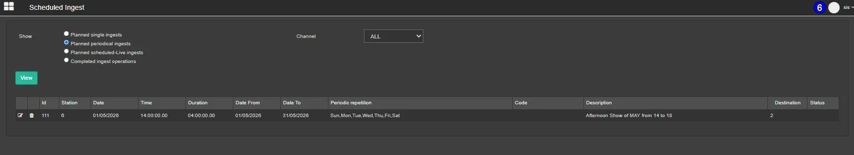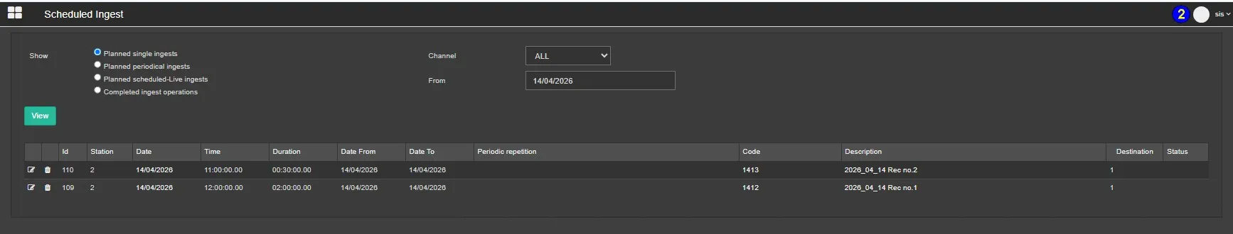 The Scheduled Ingest monitoring interface provides a complete overview of all ingest activities, with flexible filtering by type, channel, and date. It enables users to efficiently track, manage, and update scheduled recordings directly from a centralized web-based environment.