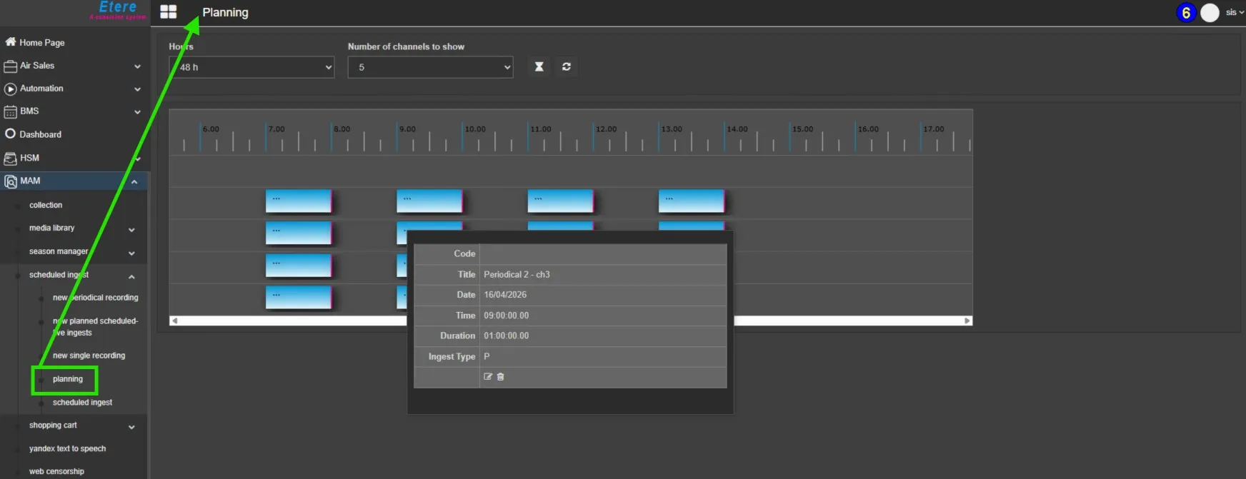 In Etere Web, the Planning section allows users to view all scheduled recordings associated with the selected channels.